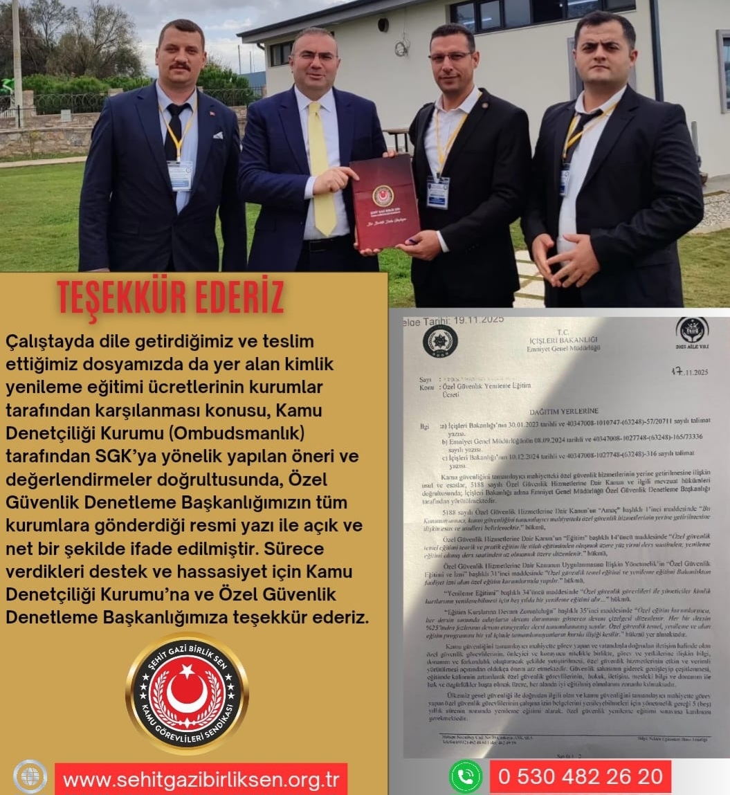 Çalıştayda dile getirdiğimiz ve dosya halinde teslim ettiğimiz talep doğrultusunda; kimlik yenileme eğitim ücretlerinin kurumlar tarafından karşılanması konusu, Kamu Denetçiliği Kurumu’nun (Ombudsmanlık) SGK’ya yönelik yaptığı öneri ve değerlendirmeler çerçevesinde, Özel Güvenlik Denetleme Başkanlığımız tarafından tüm kurumlara gönderilen resmi yazı ile açık ve net bir şekilde ifade edilmiştir.