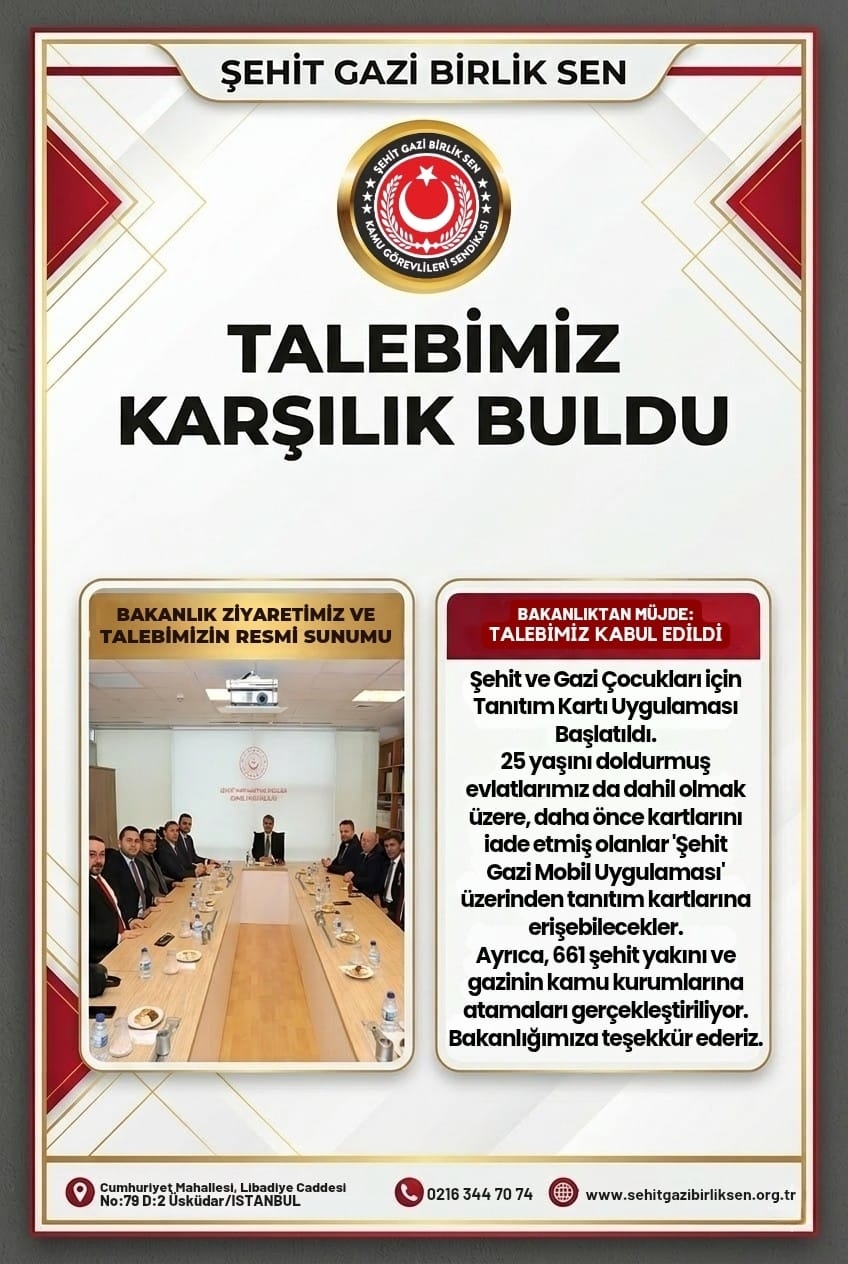 Şehit ve gazilerimizin kıymetli evlatları için uzun süredir dile getirdiğimiz taleplerimiz sonuç vermiştir.